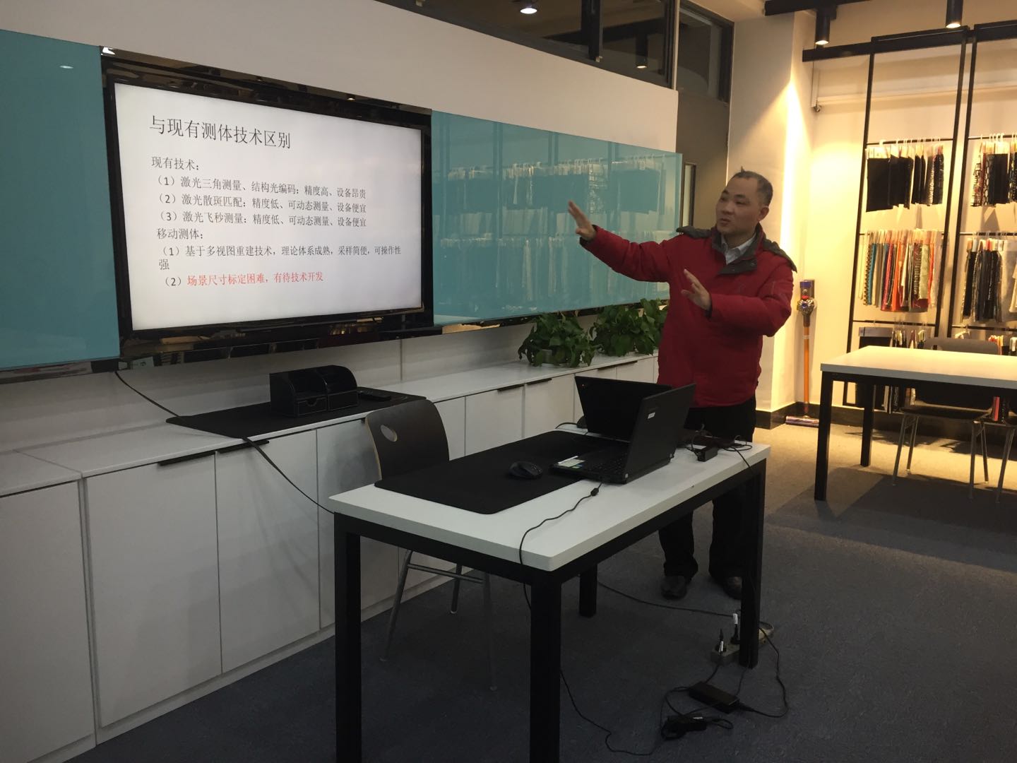 在调研会上,谢红经理就学科研究定位、核心技术问题等作学科内容介绍,她指出,纺织科学与工程学科研究定位在于面向未来,解决高性能、高功能服用产品开发的核心技术问题(运动、防护类)和面向产业,解决纺织服装产业工业智能化核心技术问题。服装产业工业智能化必须解决的关键问题在于工业数据和知识工程。接着,服装学院副教授徐增波以“移动测体技术产业化应用研讨”为题,向大家介绍了该项目应用基于多视图几何重建技术,结合“互联网+”思维,利用移动客户端普及性、移动设备计算性能及视频采集快速提升,进行基于单目相机运动体视重建的远程人体三维重建研究,以实现高效便捷的远程人体三维测量功能,为真正实现国家各区域人体数据库采集打下坚实基础,为服装工业智慧化设计知识库提供数据支撑。随后,双方就人体3D手机扫描技术的特点、核心关键技术点、测量精度、应用范畴等问题进行交流研讨。东方国际(集团)有限公司副总裁封亚培对项目下一步要做的工作提出了几点建议:1、进一步提高和完善测量精度。3D人体扫描是一种新型科学技术,用来侦测和分析人类个体的形状与外观数据,因此精准度问题是关键。2、测量不局限于定点,要有一定的便利性,符合市场的需求。
