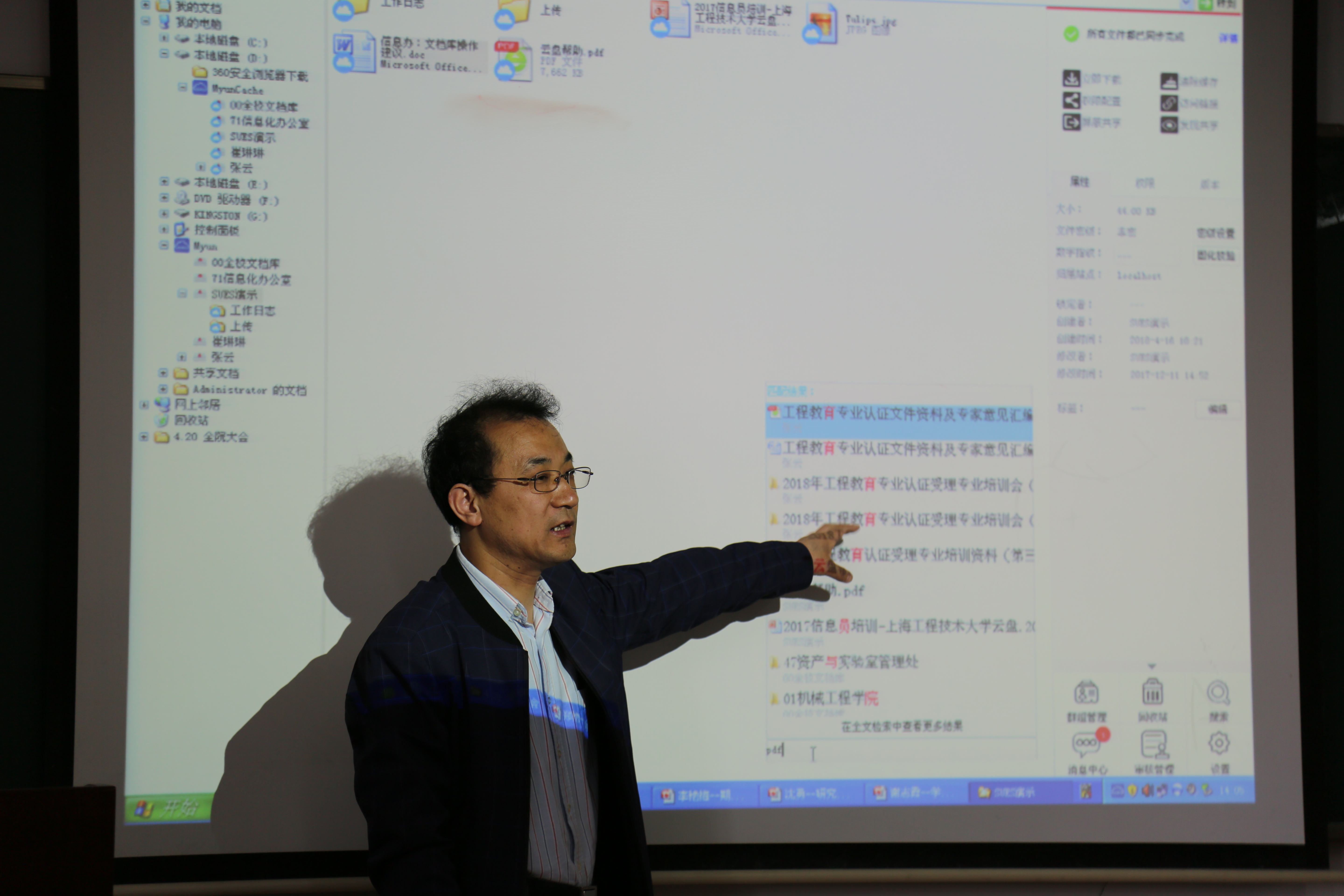 目前学院教师普遍反映对云盘系统操作不太熟悉,希望能为此做次系统培训,以便更好地掌握好云盘系统的使用。结合信息化办公室“信息服务(云盘)下学院、部门”活动,安排工作人员走进部门和学院,为教职员工解难题、送服务。4月20日服装学院特邀请到信息办夏永祥老师在艺术楼C310为全院教师讲解云盘系统如何操作使用,培训受到了广大教师的普遍欢迎与支持。