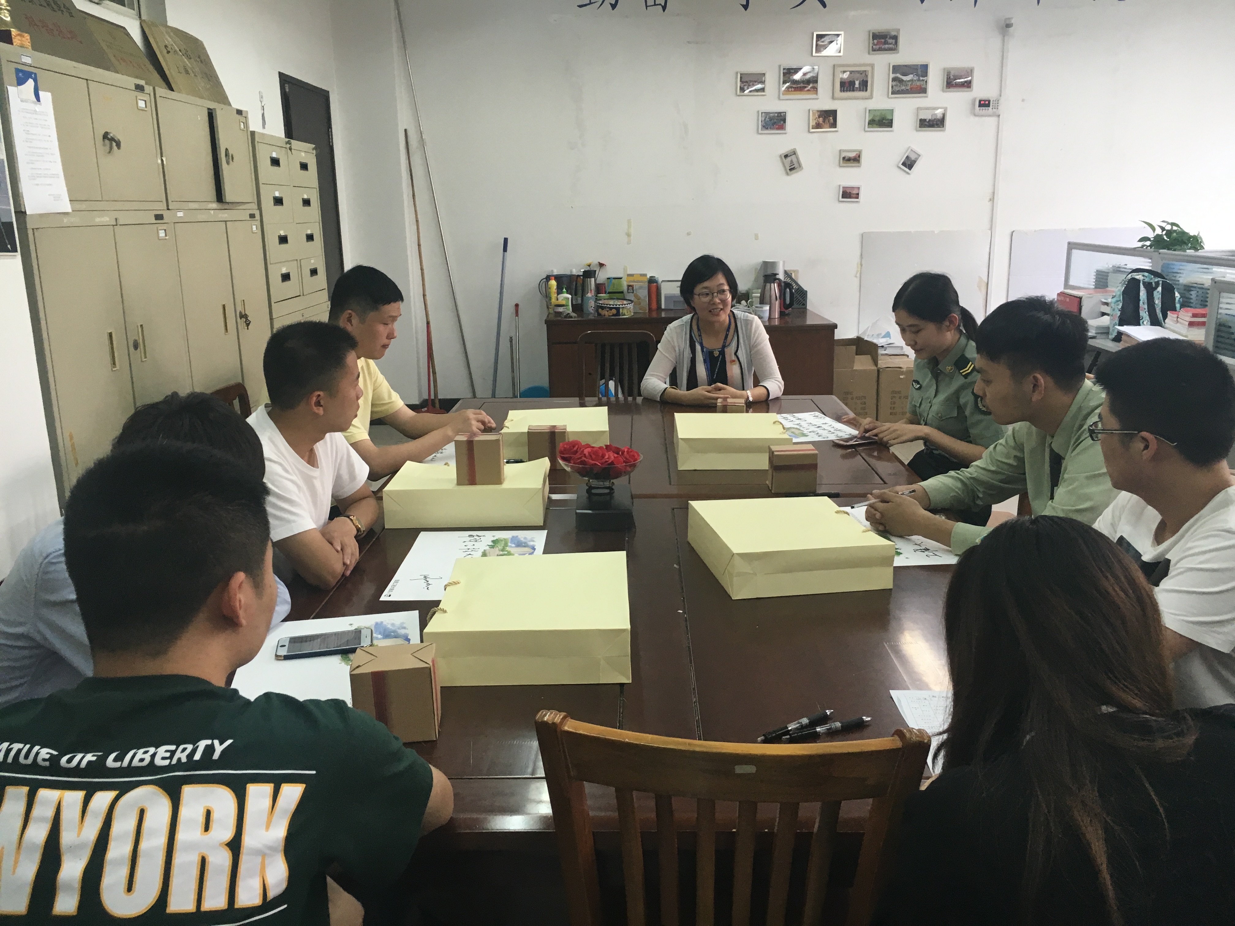 最后,谢志霞老师代表学院向退伍员工发放了纪念品,一起合影留念。