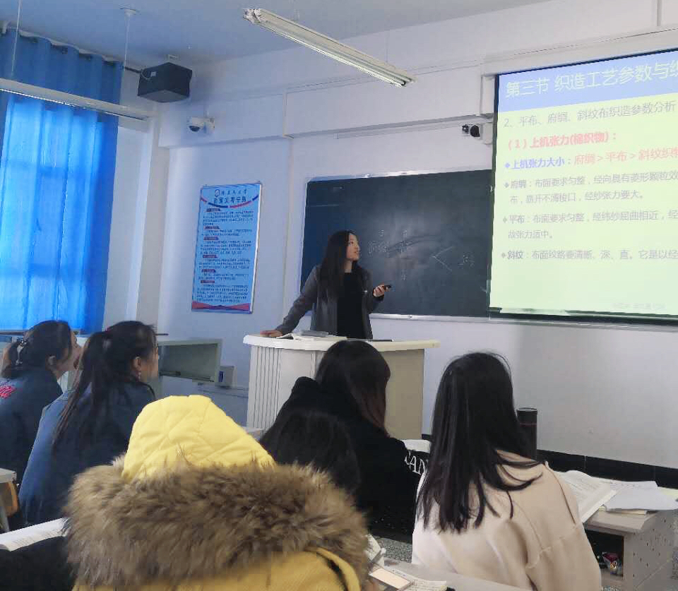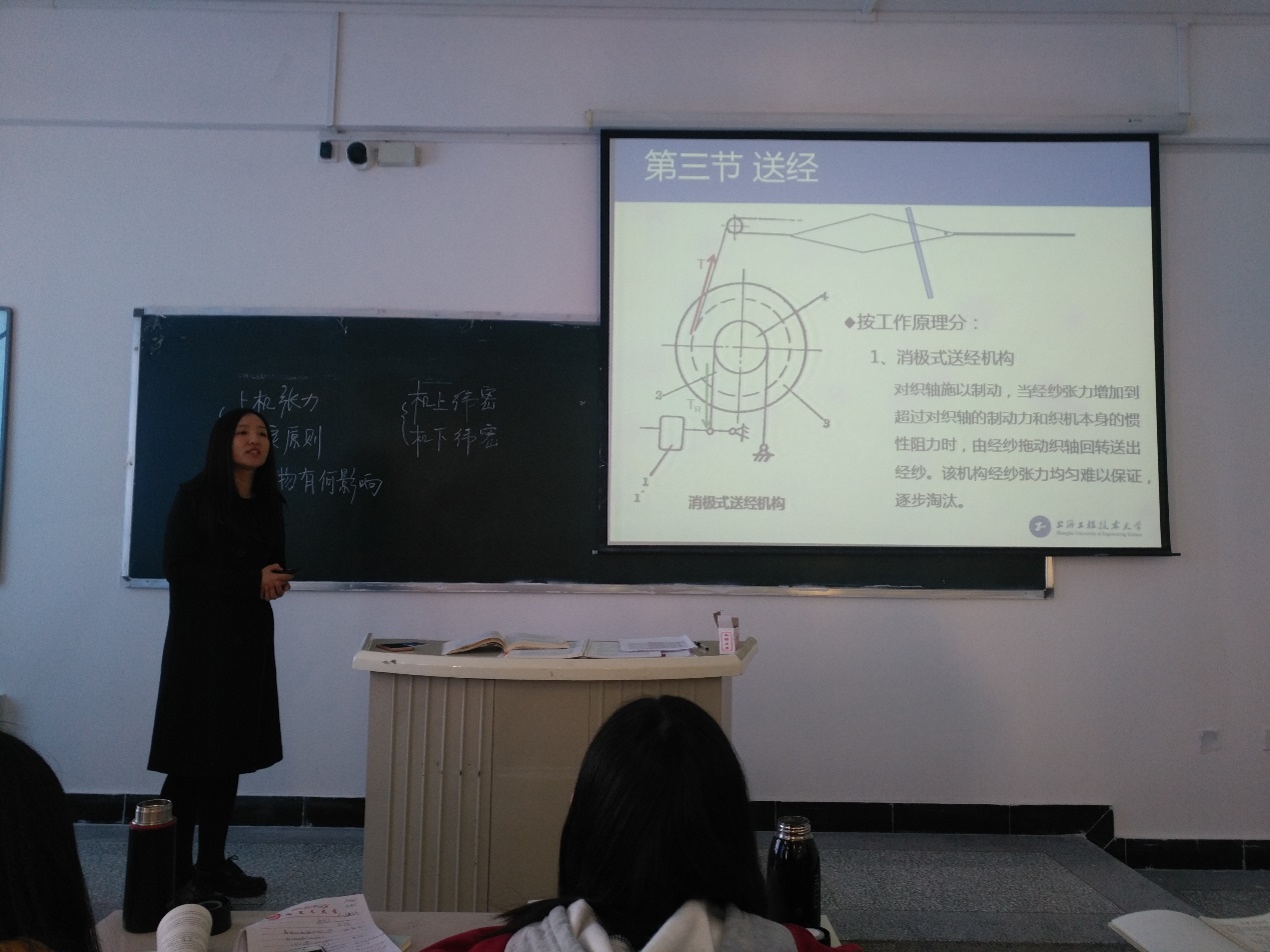 在56课时的授课中,郑老师细心负责,认真地对待同学们的每一个问题,有一次,关于“打纬区宽度”的一个概念,由于缺少相关的织机设备,只能通过图片讲授,个别同学一直无法理解打纬时织口移动对经纱张力的影响,郑老师在一天的课程结束后,一直思索着用什么办法能让员工们更好的理解呢?晚上郑老师精细制作了一个动画来演示原理,第二天到课堂上展示给同学们看,完全打消了同学的疑问,使同学们更好的掌握了这个知识点。郑老师虽然每天工作强度高,并且还需要指导在太阳成城集团的研究生们的工作,但是每天课后员工们有什么疑问郑老师是有问必答。同学们的问题有时光是课程相关的问题,还有些同学们想考研,郑老师也是热心帮大家收集相关信息,为大家提供帮助。上课期间,一名同学眼睛需要做一个小手术,三天多无法来上课,拉下十几节课的内容,周末郑老师抽出休息时间为这名同学补课。在课间,郑老师也经常和同学们聊天,鼓励同学们充分利用宝贵的大学时光,争取通过考研等渠道,走出去了解外面的世界实现自己的理想。