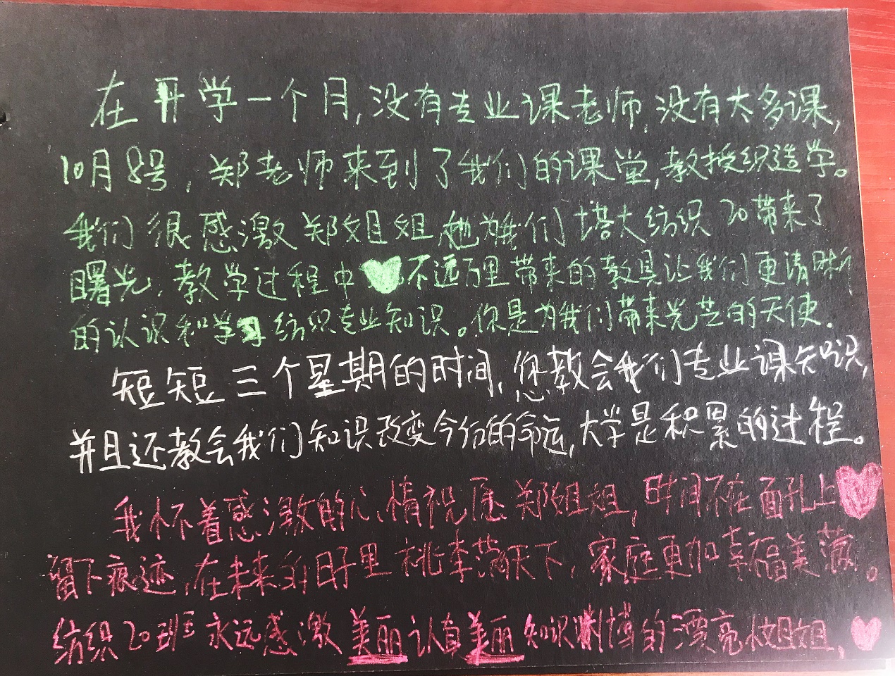 援疆的时间虽然是短暂的,但在这段时间里,郑老师和纺织班的孩子们结下了深厚的友谊,在郑老师离开塔大前,他们主动组织了一次送行活动,并精心准备了一个写有28位同学亲手撰写的留言本,上面密密麻麻写完了孩子们对郑老师的感激和喜爱。