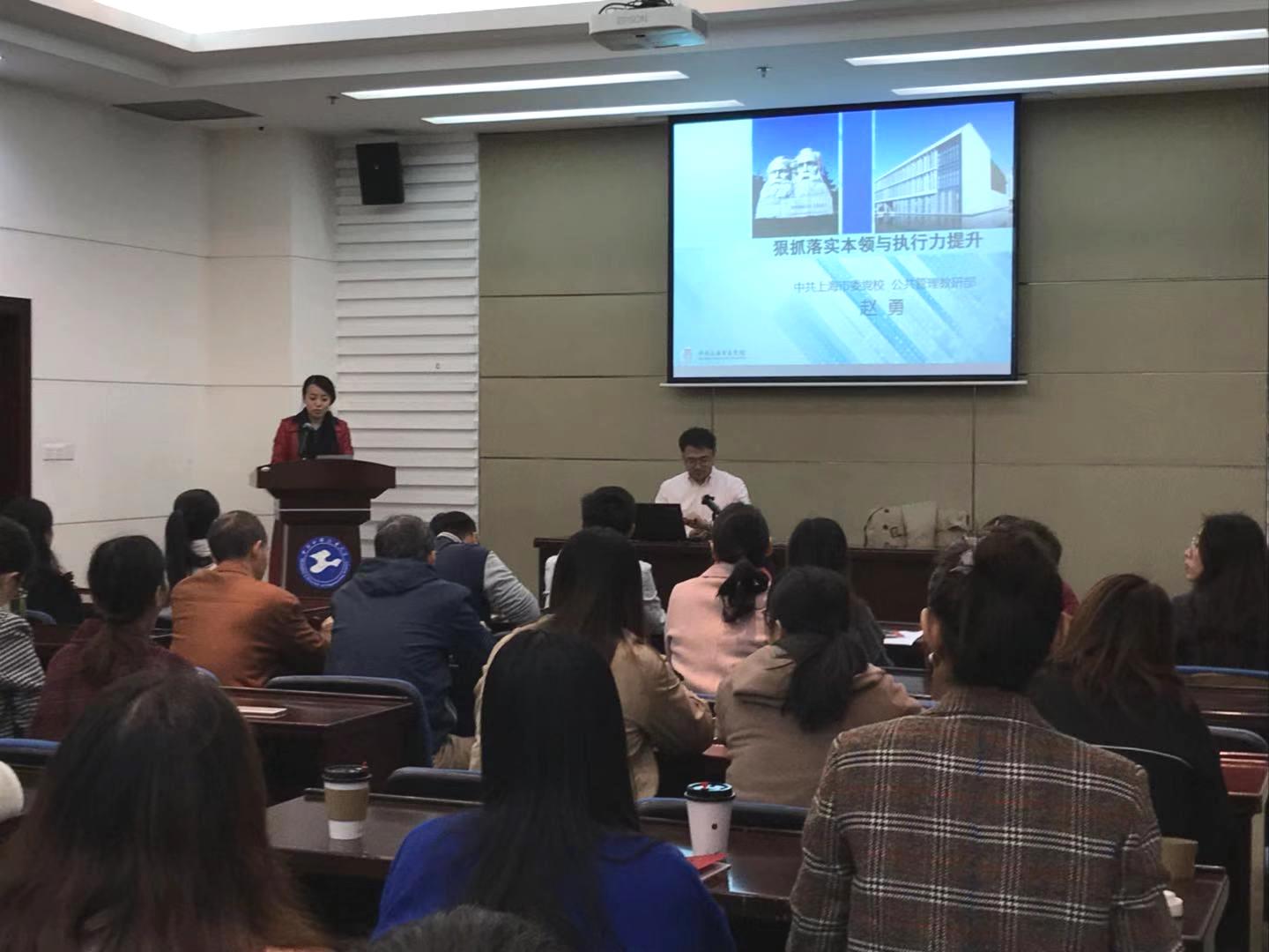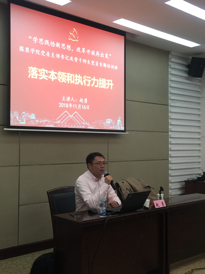 为贯彻落实巡视整改工作要求,切实把巡视反馈问题整改到位,2018年11月16日上午在图文信息中心第四报告厅,服装公司党委“学思践悟新思想,改革开放再出发”党支部书记及师生党员骨干培训班第二讲邀请市委党校赵勇教授做《落实本领和执行力提升》专题党课。服装公司党委全体委员、支部书记、党员骨干师生到场学习。会议由服装公司党委书记袁蓉主持。