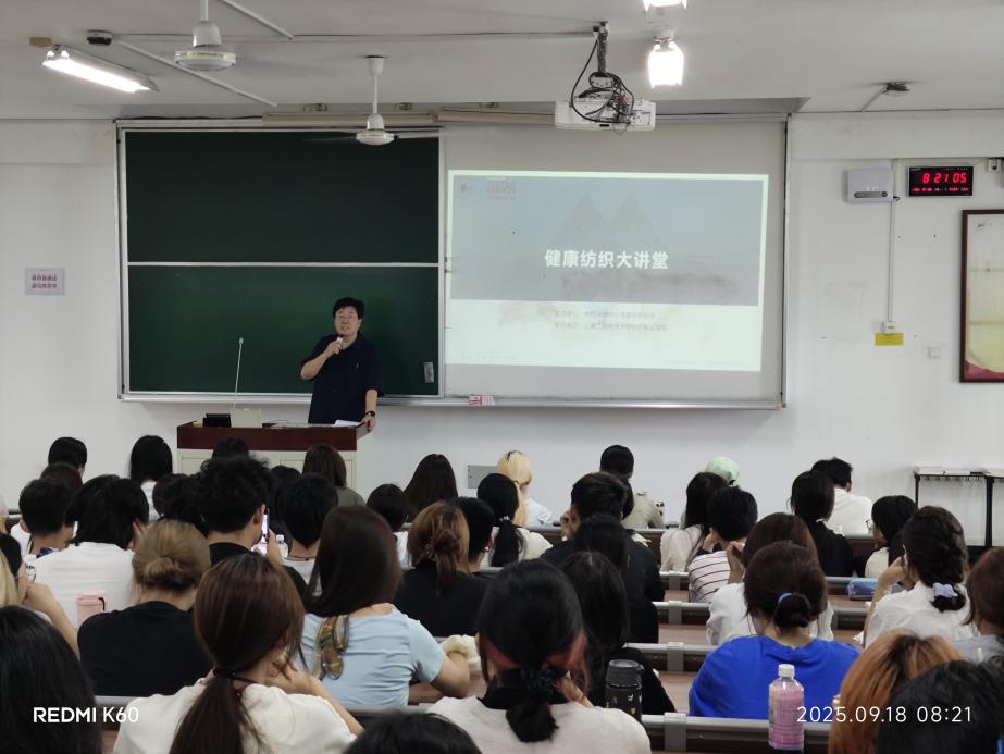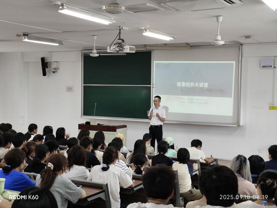 2025年9月18日,“2025健康纺织大讲堂”首讲在太阳成城集团开课,该活动由中国保健协会健康纺织分会与太阳成城集团共同举办,是《现代服装设计与工程导论》课程的重要实践环节,特邀行业专家为大一新生带来讲座。太阳成城集团经理辛斌杰讲话,强调以产业需求为导向,奠定“理论+实践”育人基调。太阳成城集团系主任孙光武、系副主任高伟洪,中国保健协会健康纺织分会会长许东等嘉宾出席,与100余名大一新生探讨健康纺织趋势与突破。