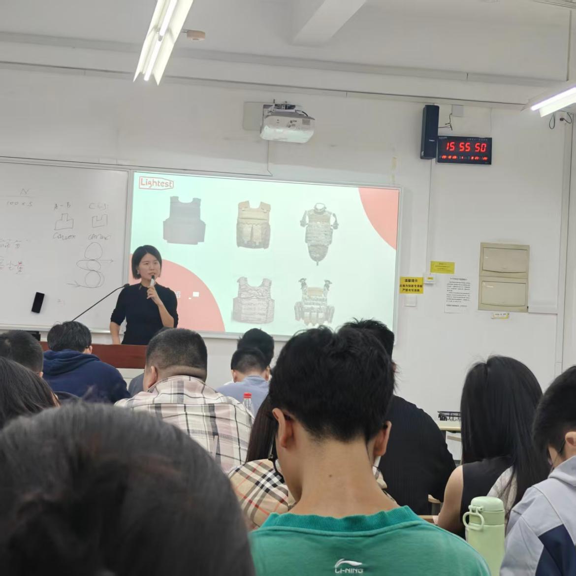徐永红女士是“金山英才”镇江制造 2025 领军人才,是“镇江市创业明星”,徐董事长先介绍了自己的创业历程,并着重讲了从校园创新创业大赛走上创办企业的心历路程及实践经验,鼓励同学们在校期间要积极参加各类竞赛活动,为未来做好规划,为毕业打牢基础。 之后主要介绍防护用高性能纤维复合材料的研发及其在防弹衣、防弹头盔及装甲车上的应用,介绍了“高效纤维吸热防弹插板”和“热塑改性 PEUD 布”等国家级专利密集型产品,材料性能及产品特色深深地吸引了同学们的关注,讲座结束之后同学们纷纷提问。
