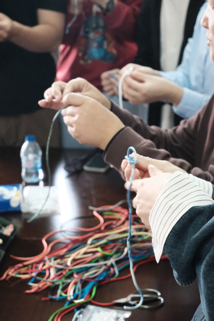 现场气氛热烈而温馨,相互交流、彼此协作,分享着创作的喜悦与心得。一根根彩线在指尖穿梭,不仅编织出精美的作品,更编织出跨越代际的师生情谊与和谐共生的文化氛围,生动诠释了“共生”的理念。