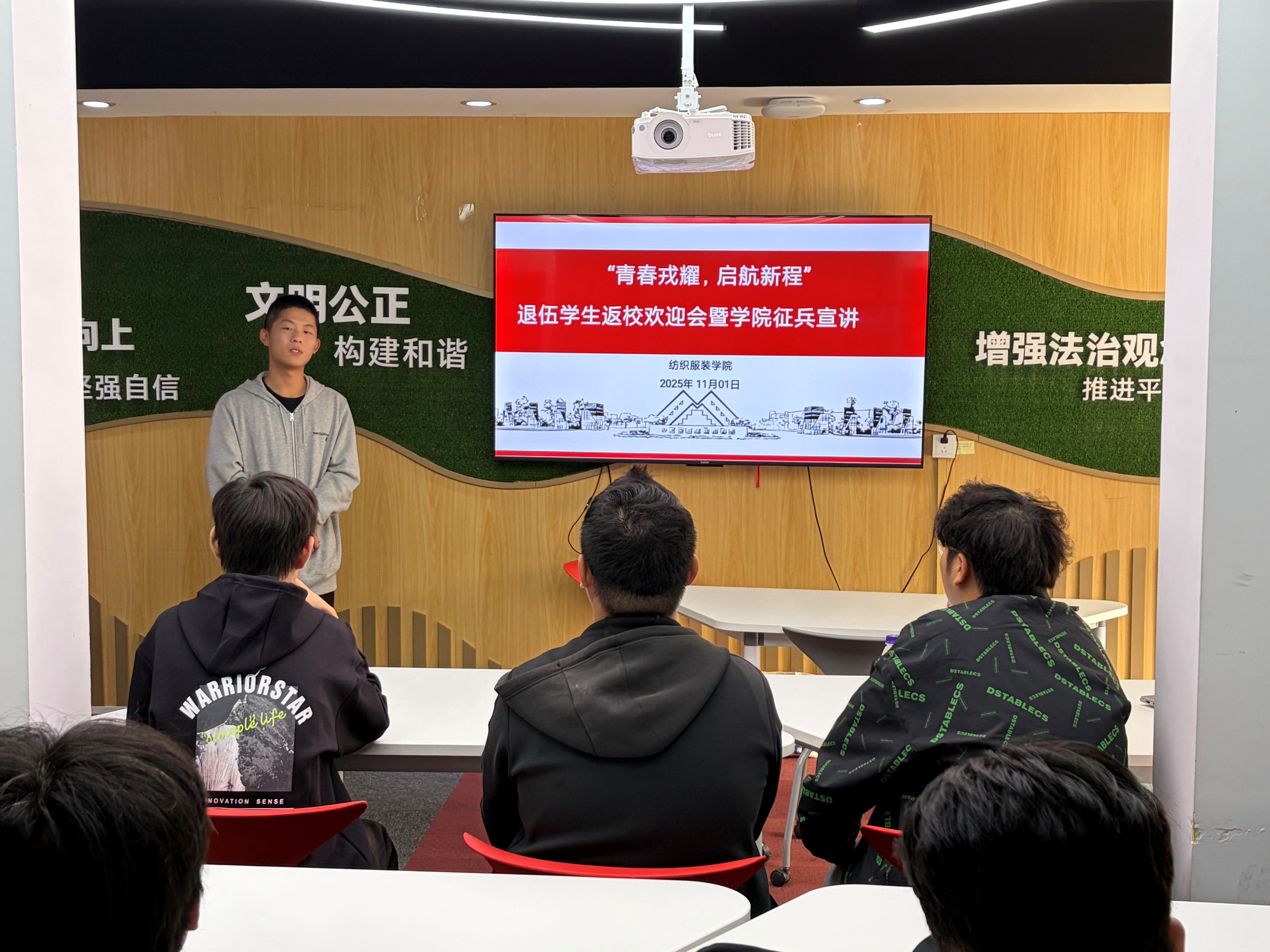 活动最后,学院热烈欢迎钟岑同学光荣退伍返校,并送上慰问品,勉励他继续发挥榜样作用,同时号召参会同学以钟岑为标杆,将个人理想融入强军实践。未来,学院将持续深化国防教育,努力向部队输送更多“有灵魂、有本事、有血性、有品德”的新时代青年,为强国兴军贡献纺服力量。