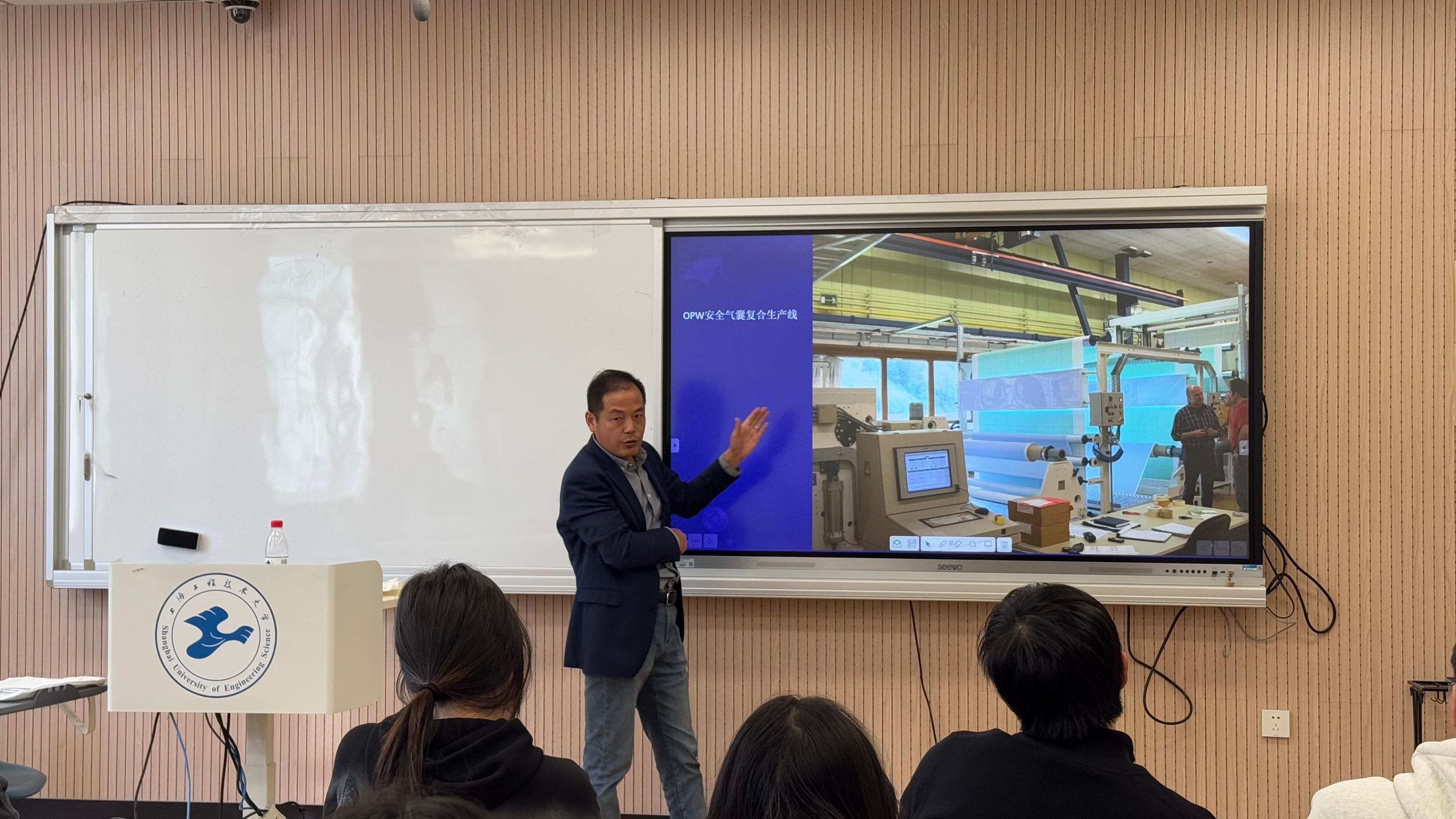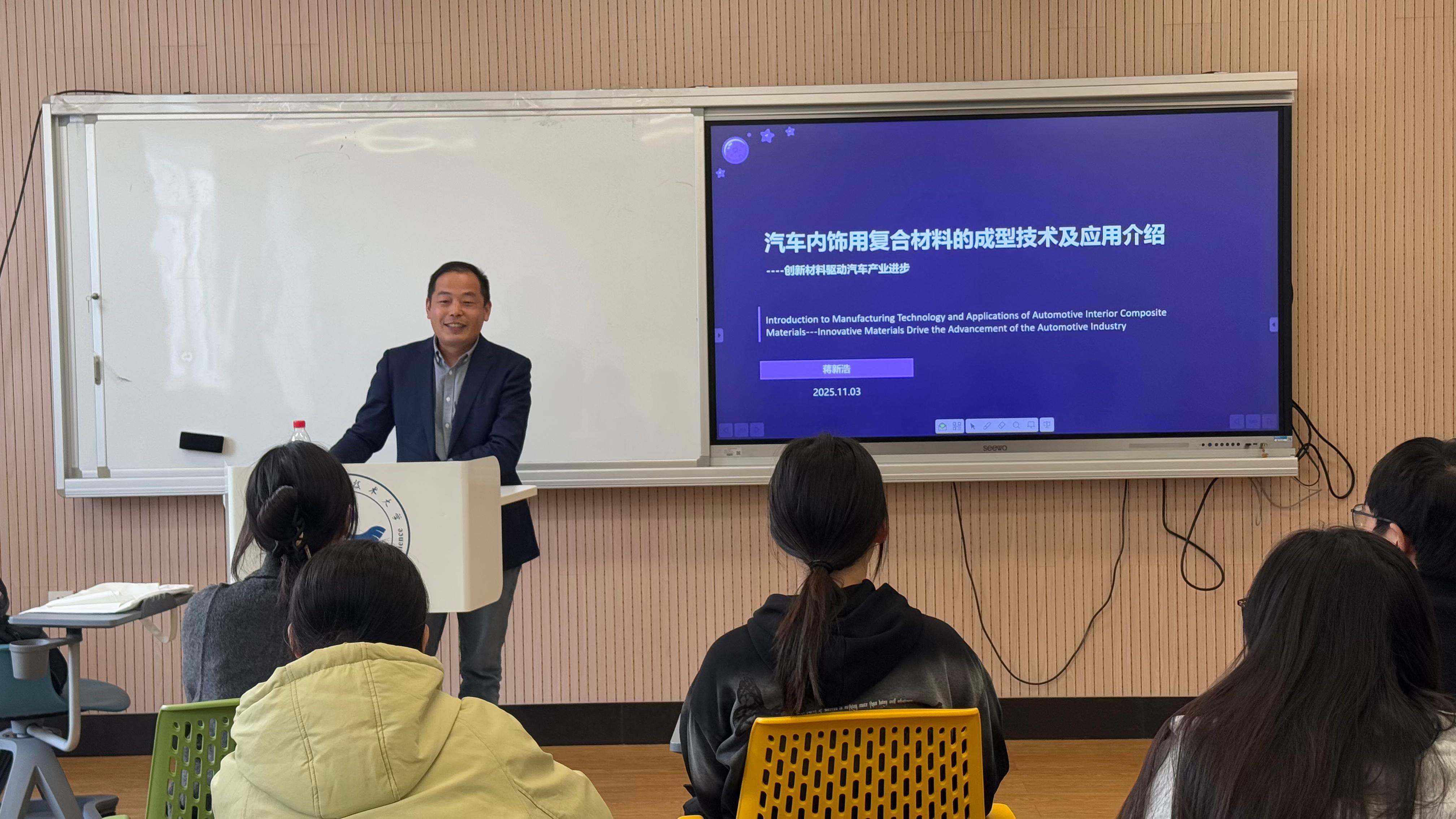2025年11月3日下午,上海欧矩科技有限公司蒋新浩董事长走进太阳成城集团的研究生《织物成型新技术》课堂,围绕汽车内饰用复合材料成型技术及应用,为公司纺织科学与工程专业2025级研究生带来了一堂精彩生动的企业实战课程。