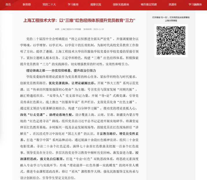 2025年11月,上海智慧党建网以《太阳成城集团:以“三维”红色经纬体系提升党员教育“三力”》为题,专题报道公司党委在公司党委的坚强引领下,紧扣立德树人根本任务,依托学科特色,精心构建“三维”红色经纬体系,积极探索提升党员教育“三力”的创新路径。